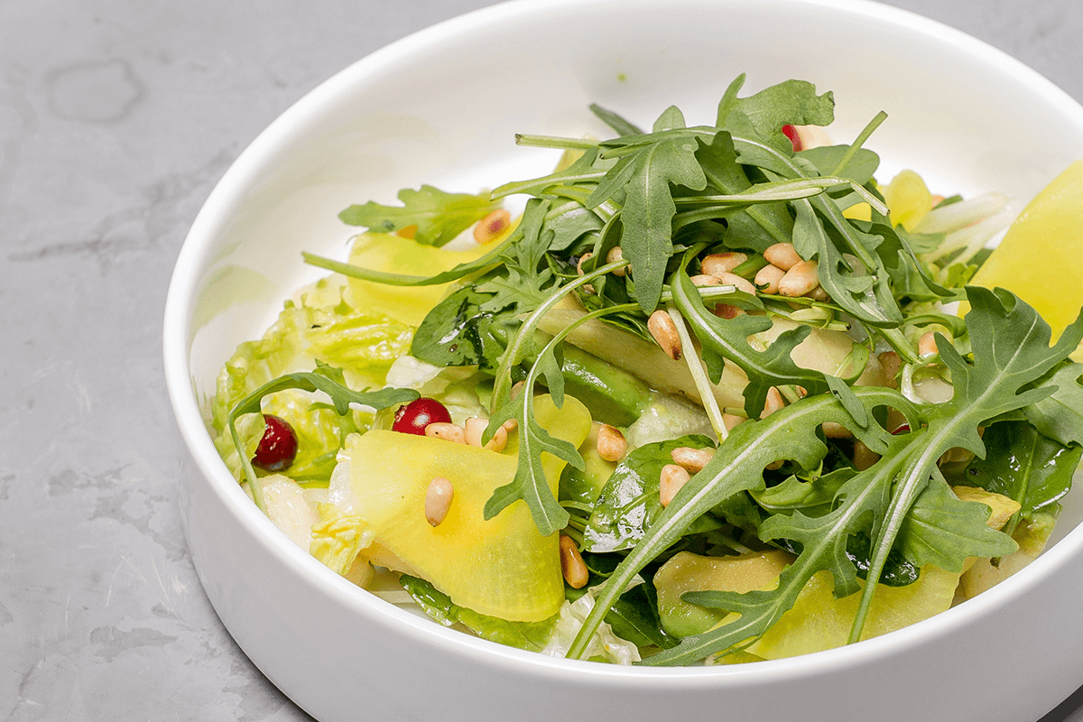 - Салат с авокадо, грушей, клюквой, кедровым орехом и медовой заправкой (150 г/9 руб.).