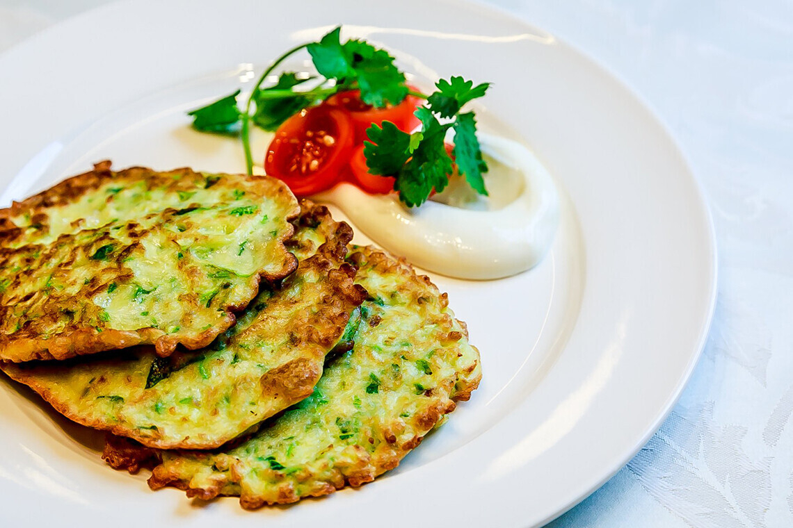 - Оладьи из цукини с томатом черри (130/30/2 г/7 руб.).