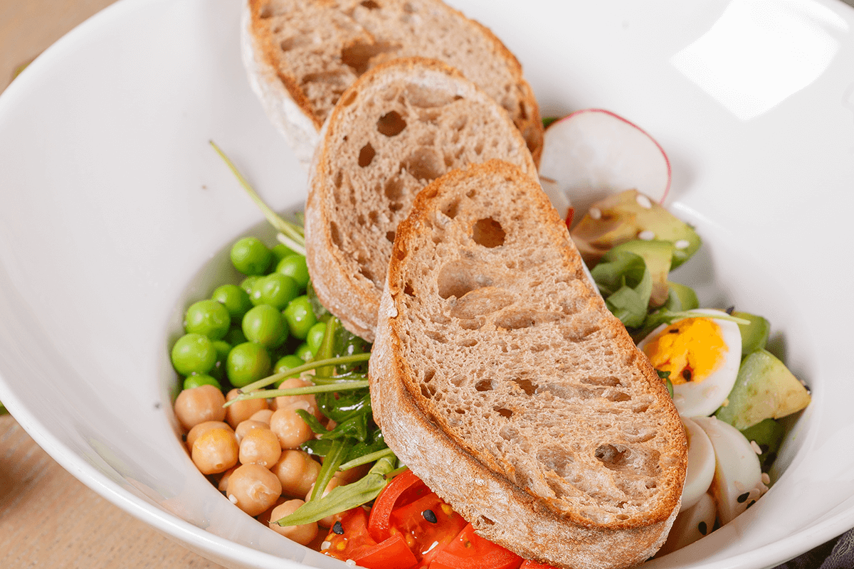 - Овощной боул с нутом, чиабаттой и медовой заправкой (210 г/50 г/10 руб.).