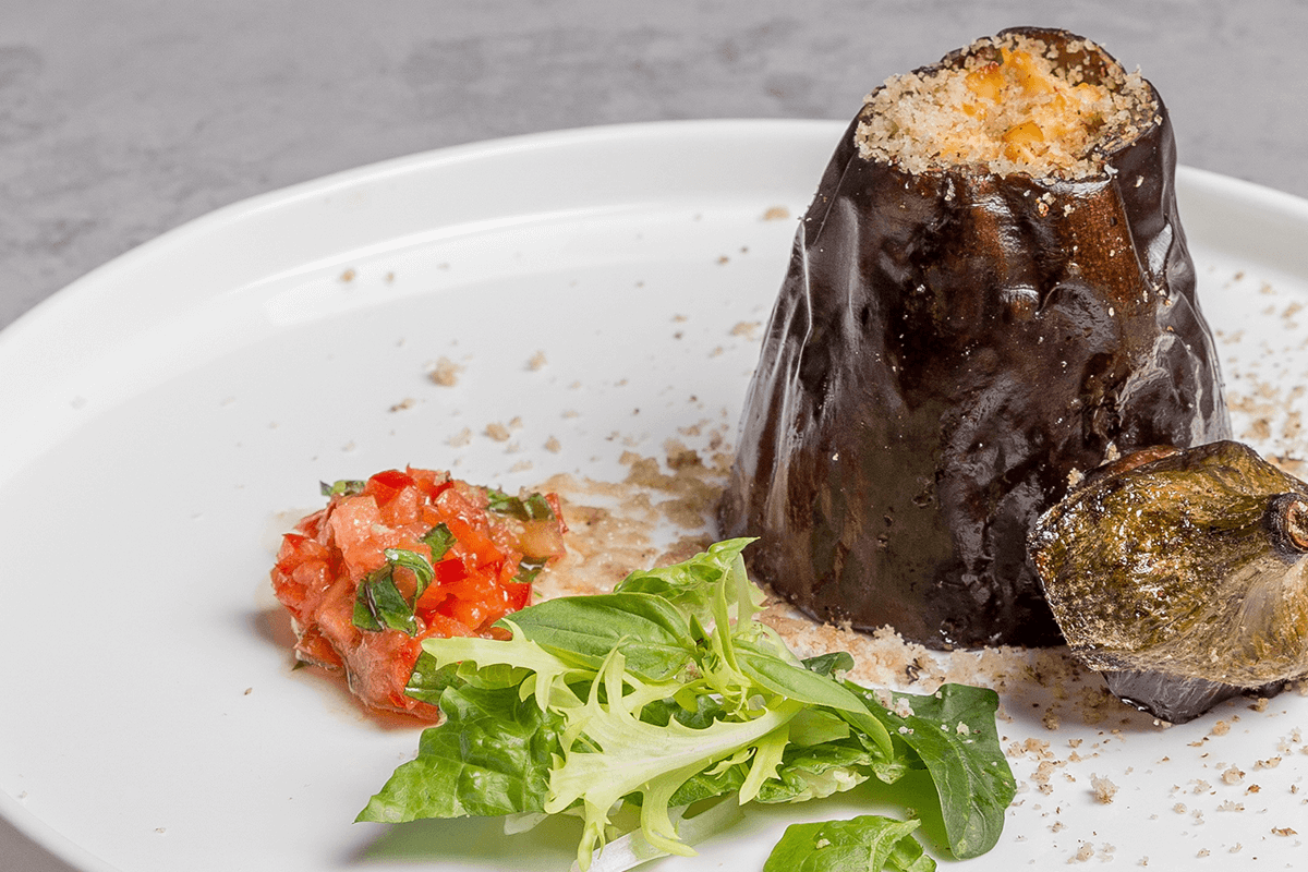 - Баклажаны, запеченные с сыром тофу и грецким орехом (160 г/33 г/13 руб.).