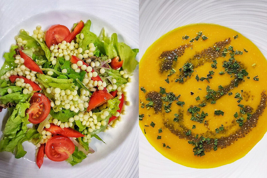 - Тыквенный суп с манговым соусом и семенами чиа (300 г/8 руб.).