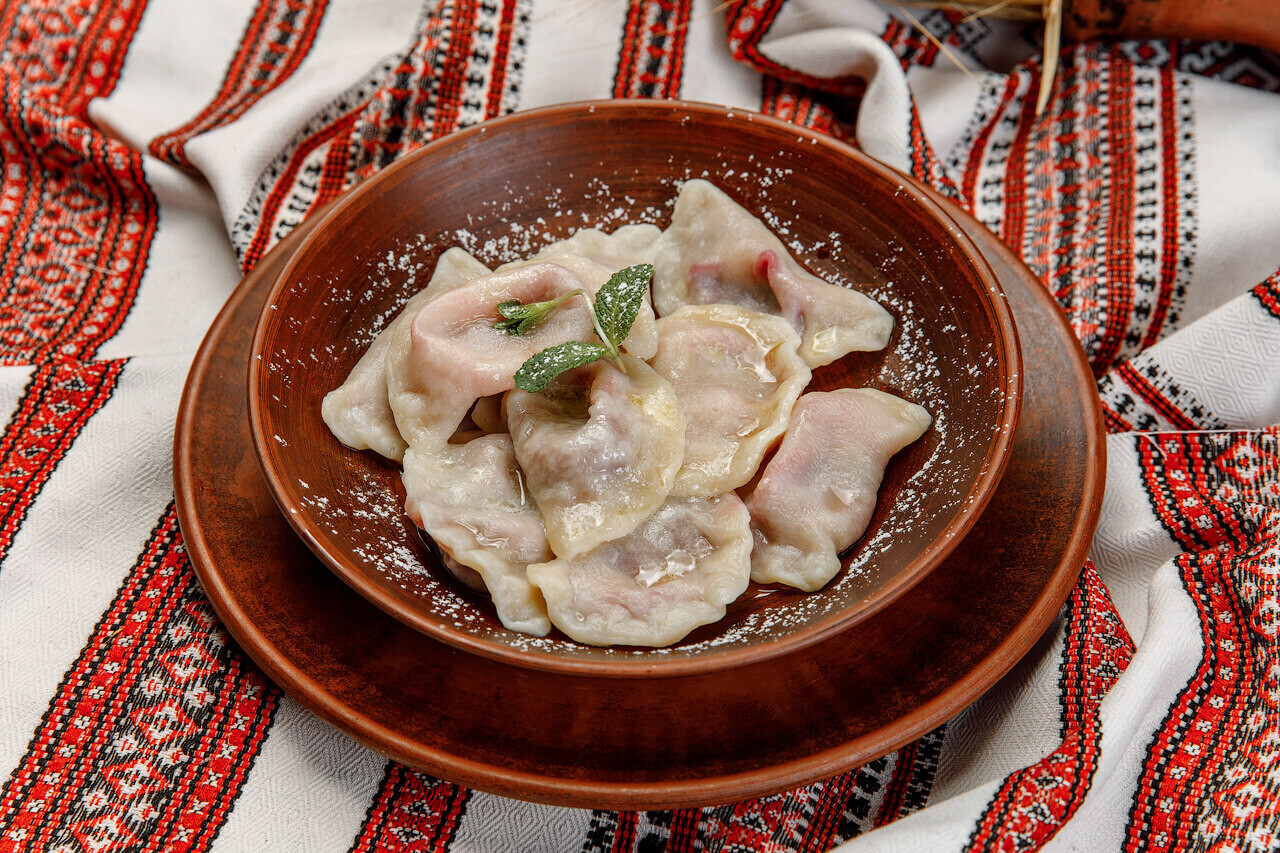 - Домашние вареники с вишней, медовой поливкой и сметаной (140 г/10 г/20 г/30 г/6 руб.).