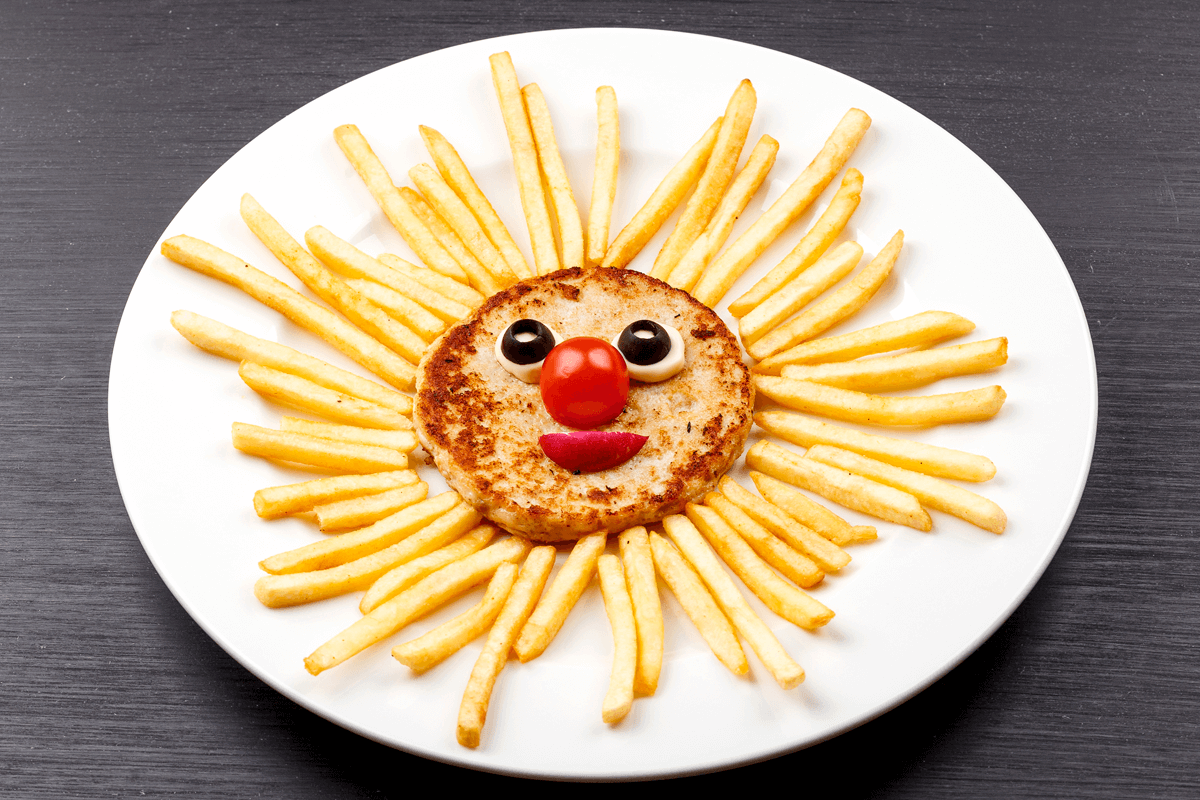 Блюда в детском меню разработаны таким образом, чтобы малышам было не только вкусно, но и интересно их есть. Например, любимое многими «Солнышко» выкладывается на тарелке «лучиками» — картофелем фри, рыбное блюдо «Гусеница» полностью соответствует названию, котлету удобно держать в маленькой руке, ведь она на палочке, а в полезном овощном салате «Клумба» красуется цветок из томата, редиса, огурца и вареного яйца.
