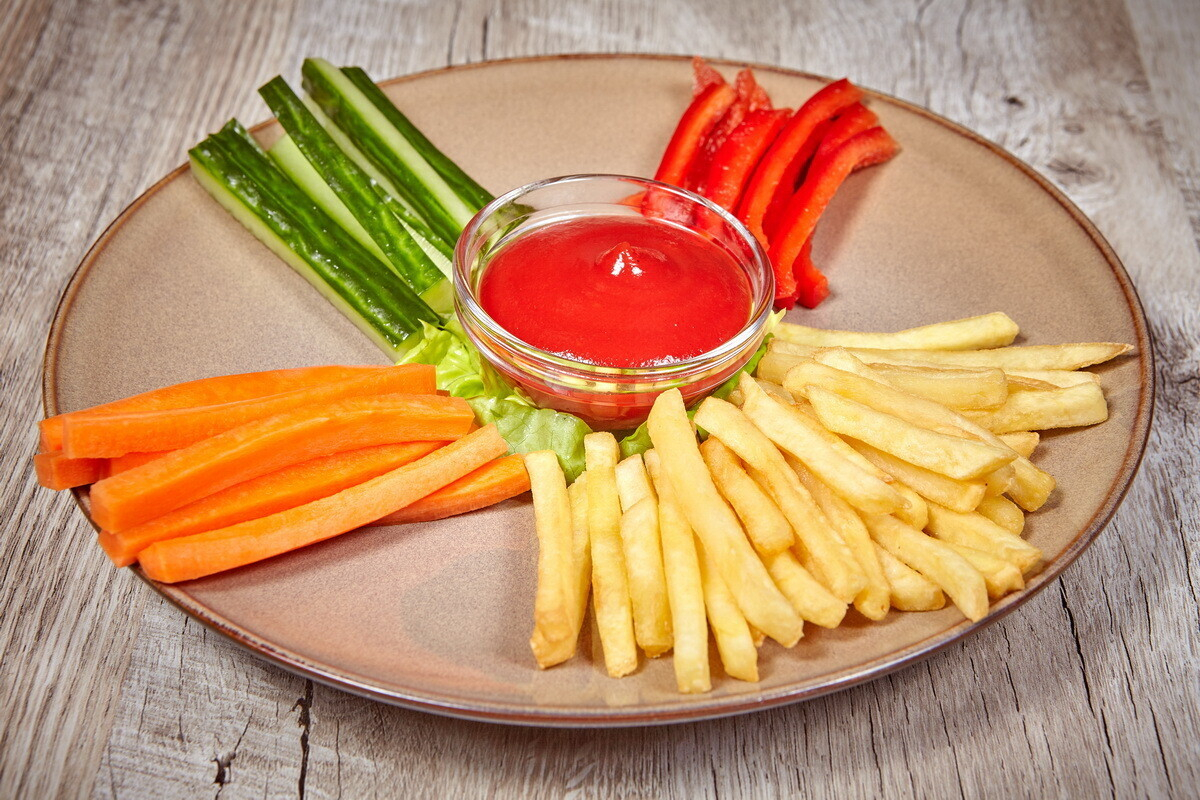 - «Солнышко» — куриная котлета, картофель фри, томаты черри, редис, маслины, майонез, кетчуп (6,10 руб.).