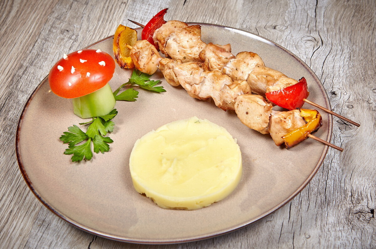 - Куриный шашлычок на шпажке со сладким перчиком, гарнир на выбор (пюре, фри, макарошки с сыром), помидорчик, огурчик, зелень (150 г/120 г/20 г/20г г/2 г/7,50 руб.).
