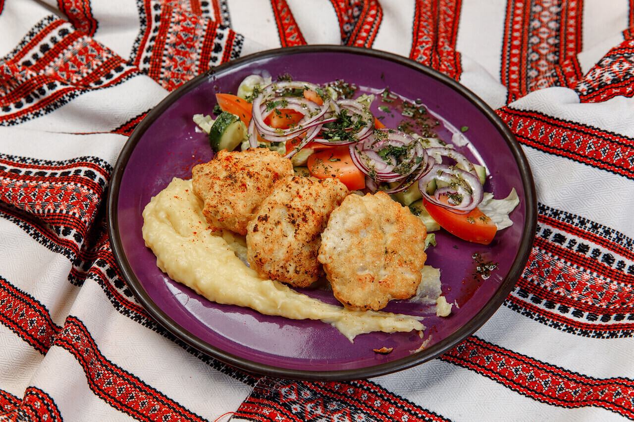 - Котлетки из птицы с картофельным пюре и витаминным овощным салатом (100 г/100 г/70 г/7 руб.).