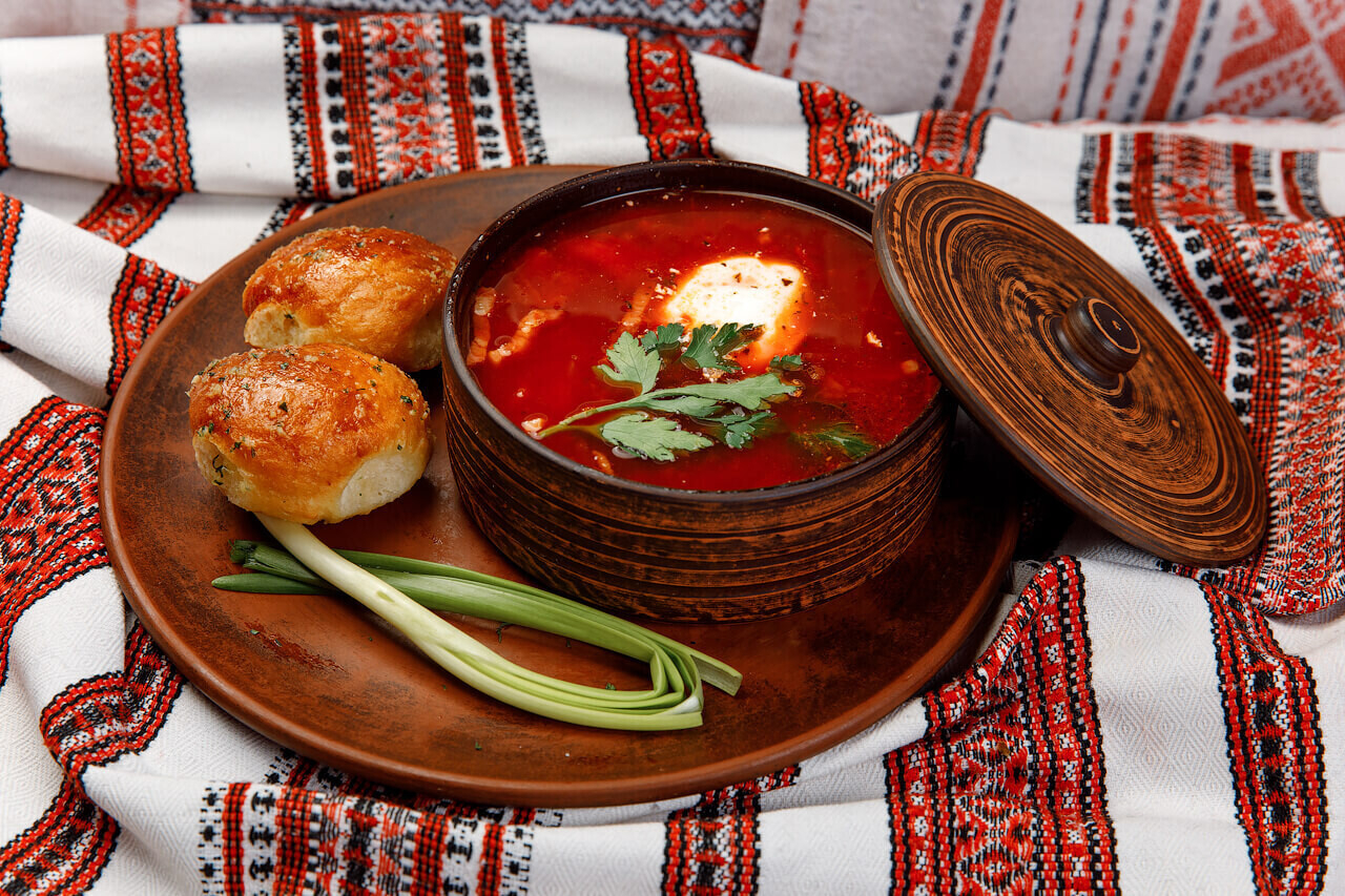 - Традиционный украинский борщ с пампушками (250 г/30 г/50 г/6 руб.).