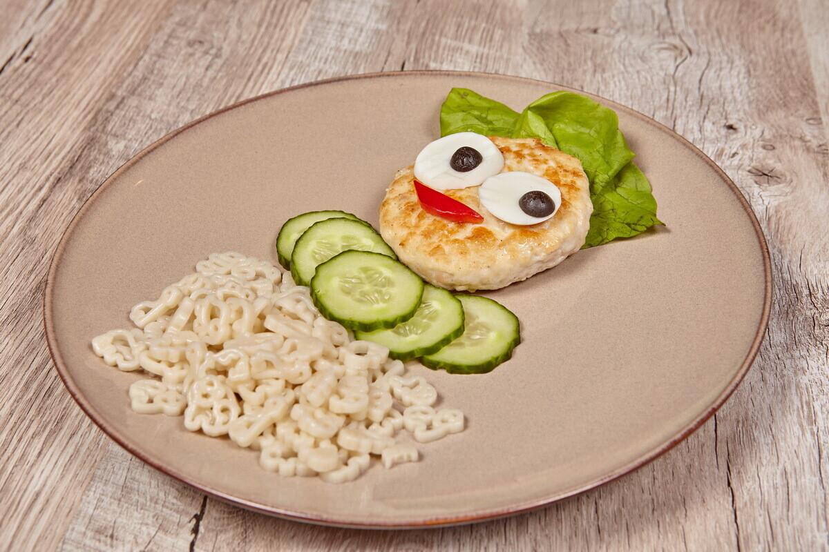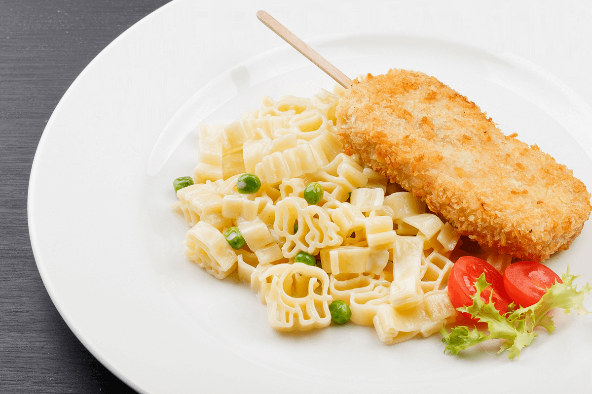 - Куриная котлетка на палочке в панировке, паста Animaletti, сливки, горошек зеленый, фризе (6,80 руб.).