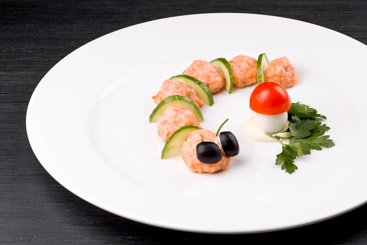 - «Гусеница» — семга, лук, сливки, маслины, огурец свежий, яйцо перепелиное, томаты черри, петрушка, майонез (8,50 руб.).