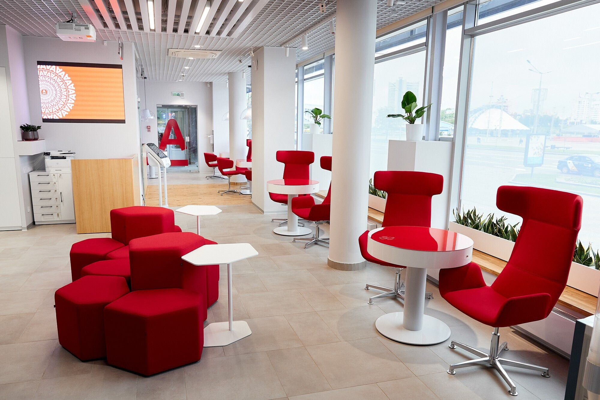 Отделение банка расположилось в начале проспекта, напротив Троицкого предместья. Это пространство со столиками, мягкими креслами, книжными стеллажами, переговорными комнатами и кофе-поинтом. Кроме того, здесь круглосуточно будут работать инфокиоск и ресайклер.