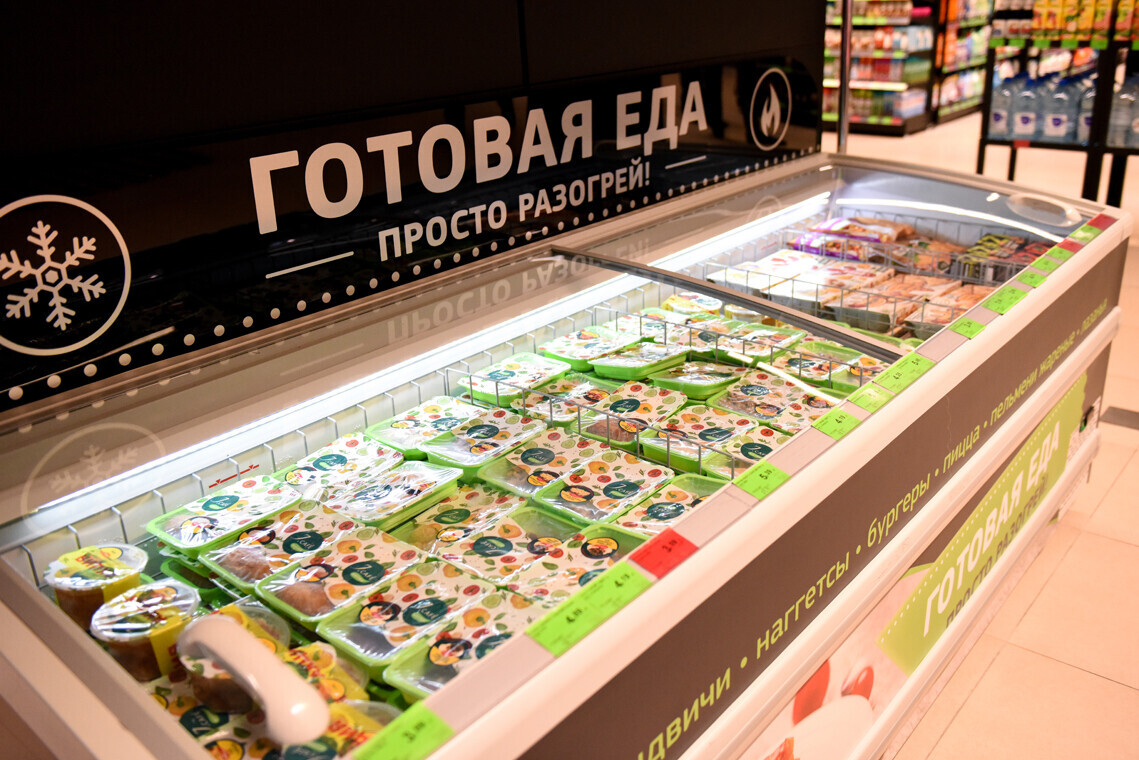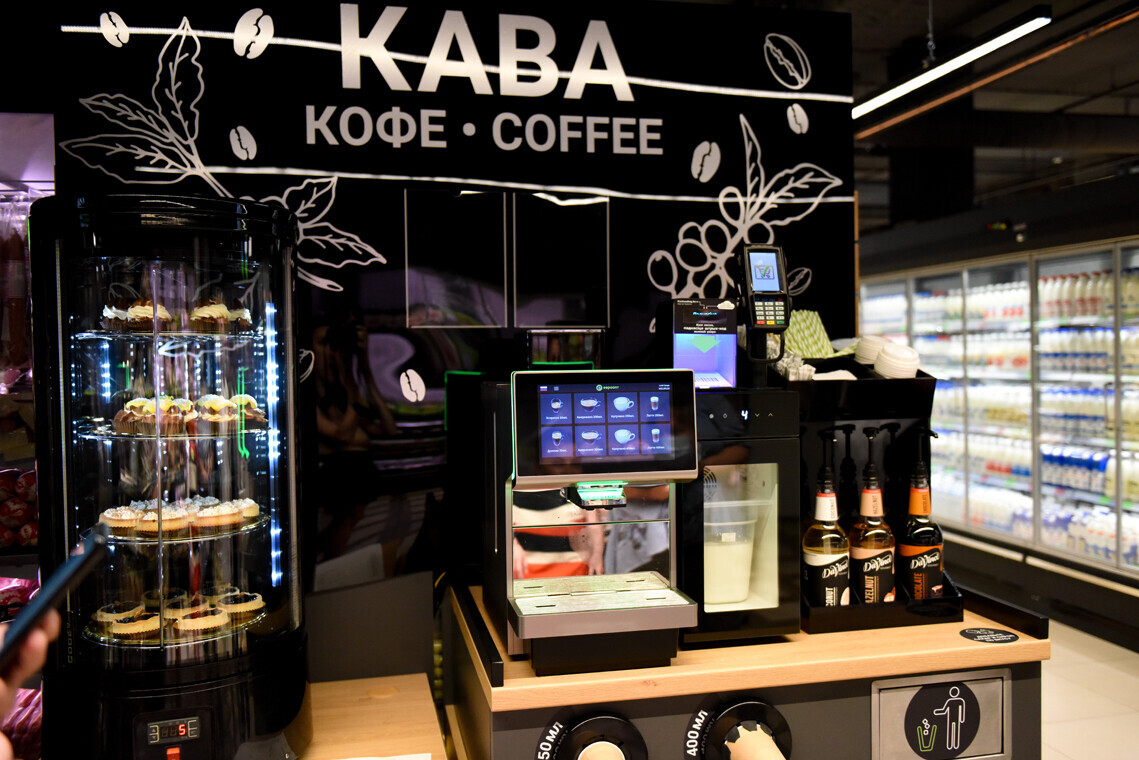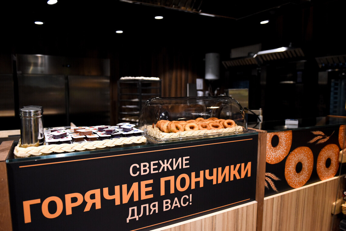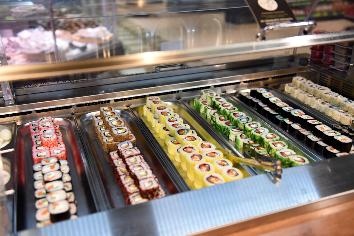 Предусмотрен салат-бар и суши-бар, а пиццу можно заказать с помощью специального аппарата: выбираешь на мониторе, оплачиваешь и видишь, сколько времени осталось до готовности. Есть также кофе-поинт с функцией оплаты на месте, секция свежей выпечки и кондитерский отдел с тортами и пирожными.