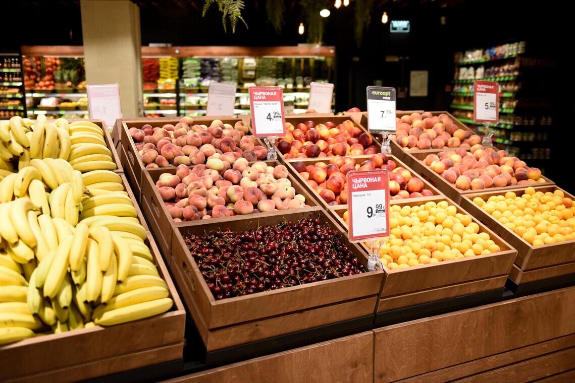 В отделе овощей и фруктов представлены азербайджанские помидоры, крымский лук, узбекский лимон и баклажан граффити. Вместе с яблоками, грушами, апельсинами и сливами присутствуют экзотические папайи, гуава и пепино. Есть также свежие ягоды: черешня, клубника и малина.