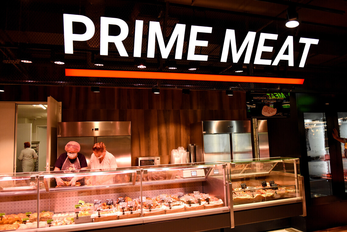 В мясном отделе можно купить выдержанный стейк. Есть выбор свинины, говядины, диетической индейки и кролика. За помощью в подборе правильного куска можно обратиться к специалисту в магазине, также прямо на месте при необходимости мясо переработают в фарш.
