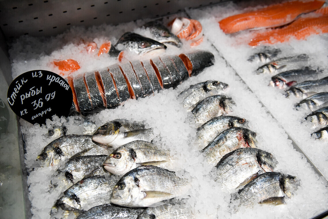 В зоне рыбы и морепродуктов есть свежие сибас и дорада (по 19,99 рубля за кило) либо уже расфасованные мидии, креветки и улитки. Свежую рыбу почистят на месте.
