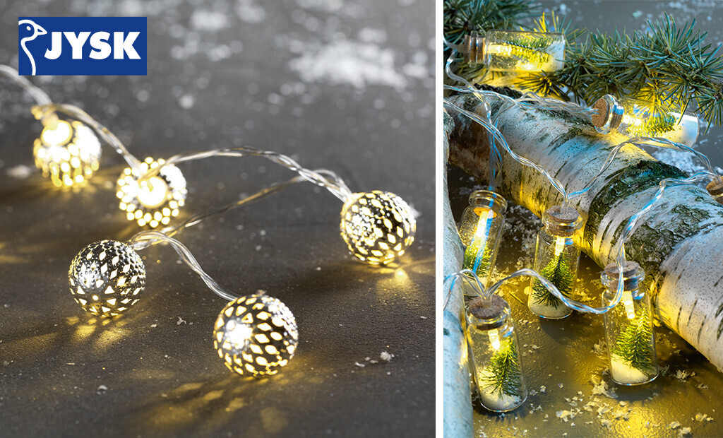 Вместо классической световой гирлянды тоже можно использовать более современный и инновационный подход. Гирлянда FYLGJER состоит из 10 светодиодов в стеклянных баночках, внутри которых разворачиваются целые зимние пейзажи с елочками и искусственным снегом. А в гирлянде GAGAT светодиоды находятся внутри стальных шариков, которые напоминают расписные елочные игрушки. Свет, проходящий сквозь резные узоры, очень красиво рассеивается и создает причудливые узоры на стенах.