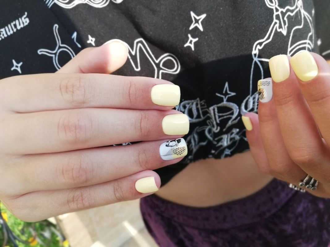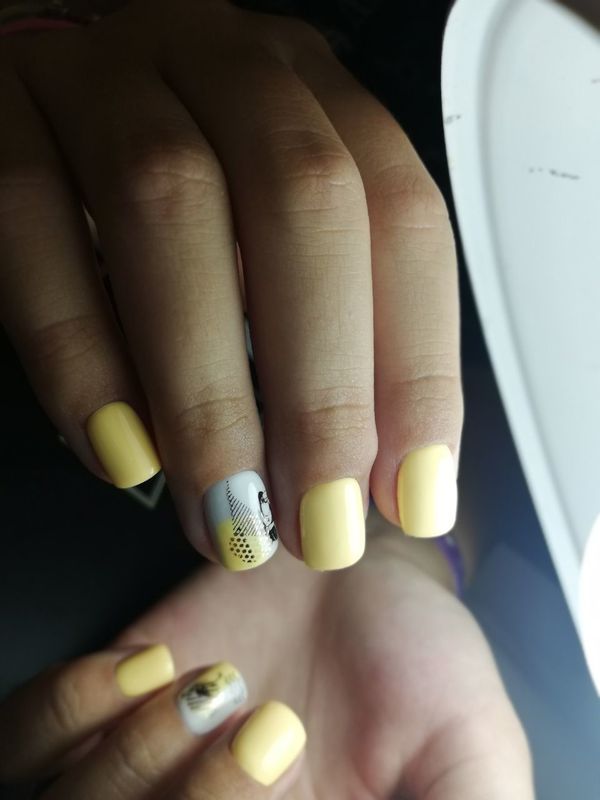 - Желтый повседневный маникюр. Выбирайте светлые оттенки, все варианты горчичного. Для повседневного маникюра можно использовать акцентный рисунок на одном из ногтей, градиент от лимонного к белому, от оранжевого к темно-желтому, от серого к лимонному. Если у вас есть аксессуары таких оттенков — подбирайте покрытие в цвет.
