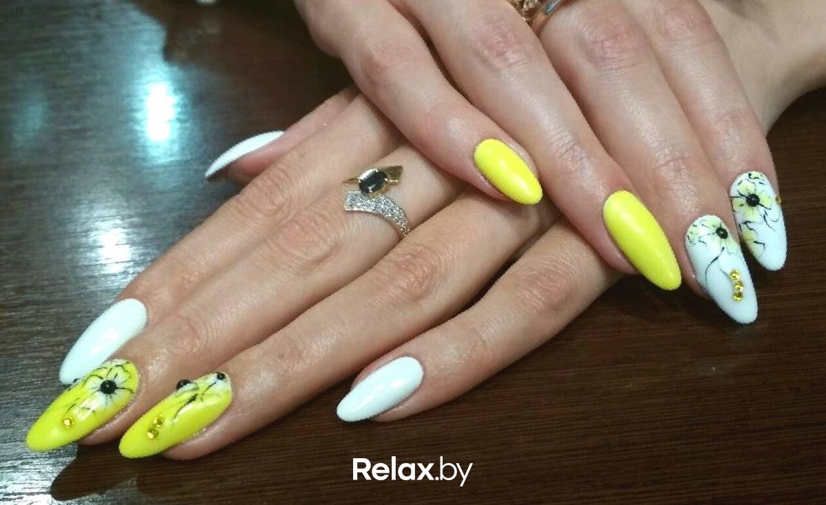 Современные техники нанесения рисунка на ногти можно разделить на ручные и с использованием готовых наклеек, переводных изображений. В обоих случаях маникюр привлекает внимание, а удачное сочетание цветов поможет сделать заметный и необычный маникюр. В желтом маникюре с рисунком обычно используют контрастные цвета: черный, синий, темно-оранжевый. Популярными можно назвать изображения апельсина в разрезе, цветочный маникюр, сочетание зеленого и желтого.
