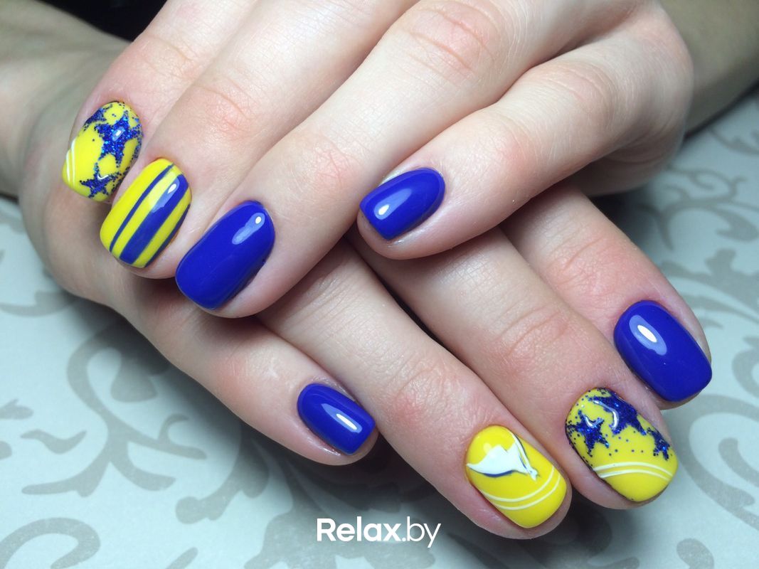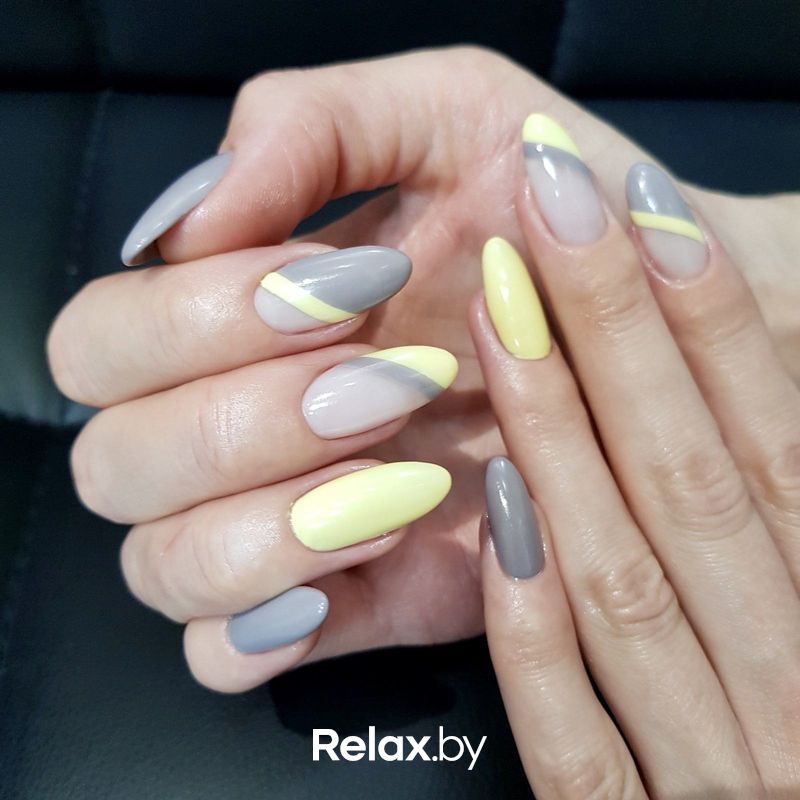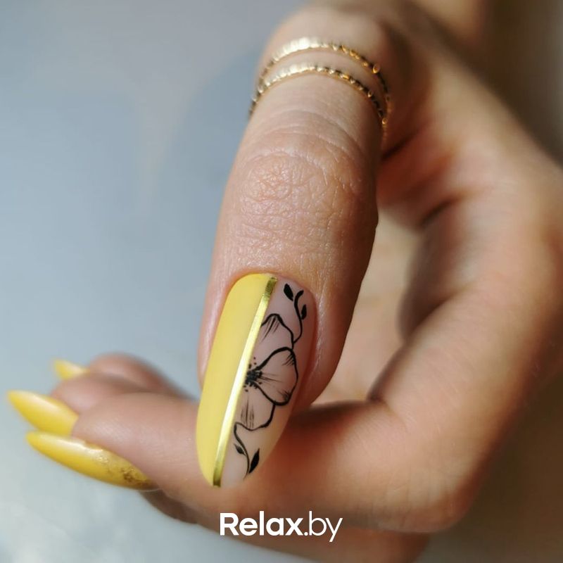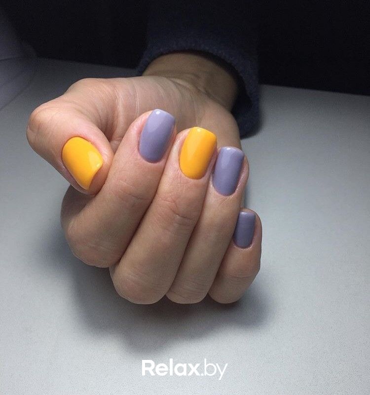 Кроме черного, популярными контрастными оттенками для желтого маникюра являются синий, голубой, серый, зеленый. При подборе обращайте внимание, чтобы оба оттенка были либо из теплой, либо из холодной палитры. Можно выбрать нанесение узора на фоне, либо контрастную очередность, когда один ноготь окрашивается, например, в желтый, а следующий за ним — в контрастный цвет.