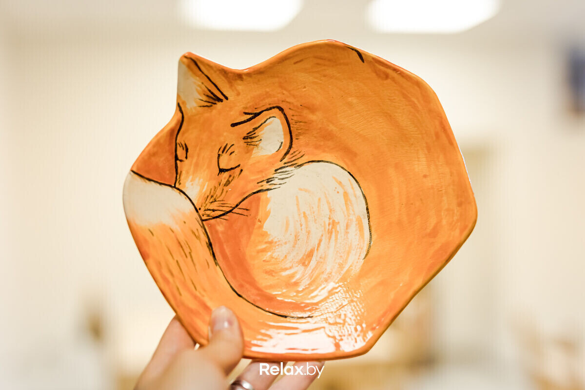 На мастер-классе вы создадите оригинальное декоративное блюдо, которое будет радовать вас дома. После оформления работа покрывается специальной глазурью и обжигается в печи. Краски для росписи беспроблемно смываются, не оставляют пятен на одежде, ими могут рисовать даже маленькие дети. Готовое изделие получится забрать через 5-7 дней. Из расписной посуды можно есть и пить, это абсолютно безопасно.
