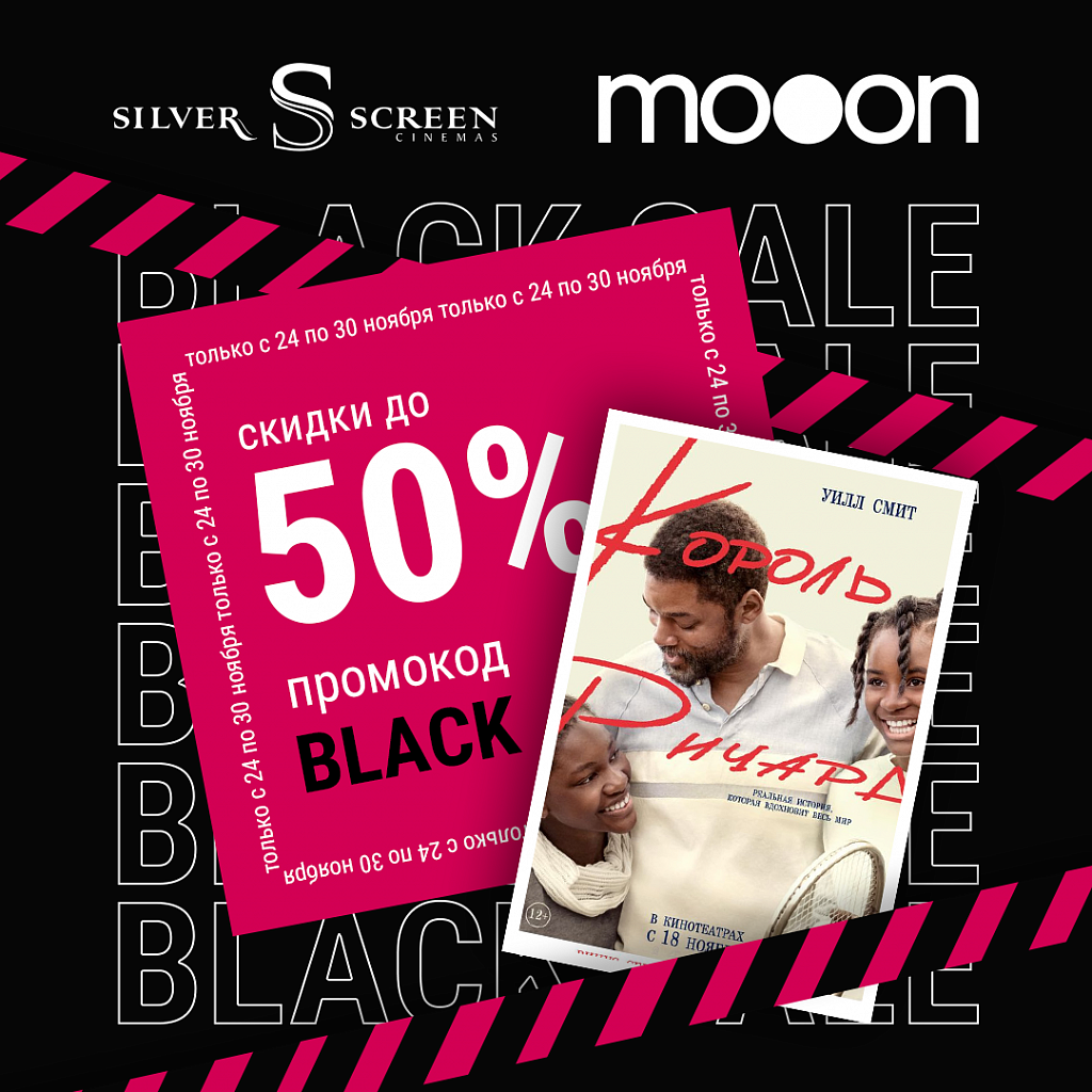 Разукрасьте эту серую осень яркими эмоциями и отличным настроением. Только с 24 по 30 ноября во всех кинотеатрах Silver Screen в Минске и MOOON в Гродно — погружайтесь в мир кино со скидами на билеты от 25% до 50% по промокоду: BLACK. Такое бывает только раз в году!