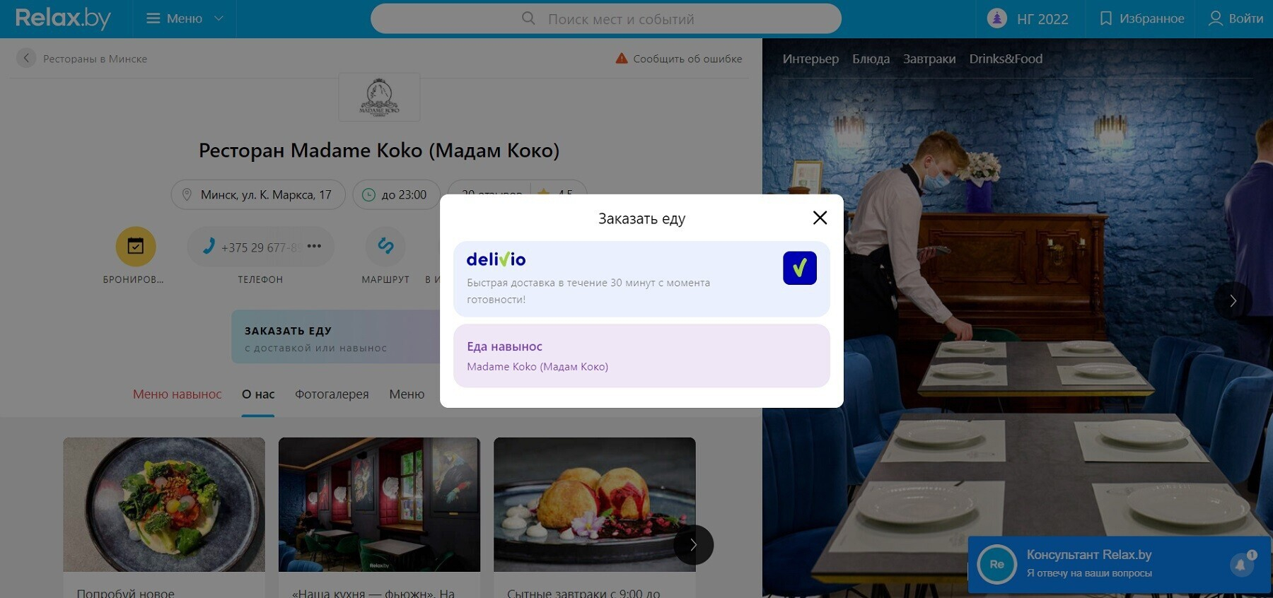 Теперь в каталоге портала можно не только забронировать столик, но и заказать еду навынос или доставку блюд из заведений, которые подключены к сервису Delivio. Все, что нужно, — выбрать заведение на Relax.by.