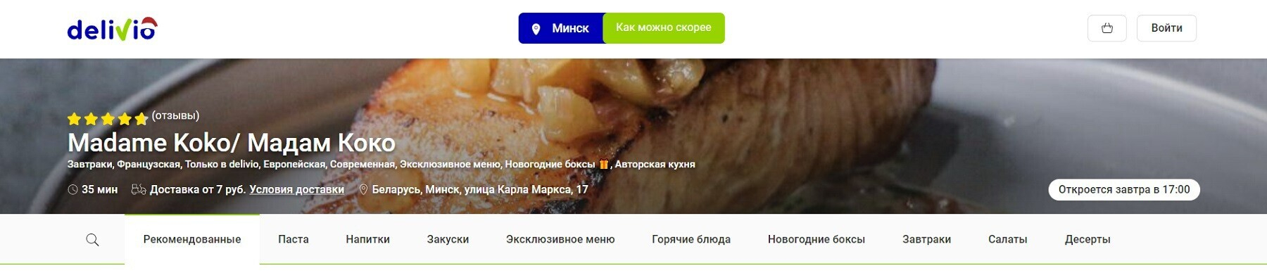 - выбирайте «Delivio: быстрая доставка в течение 30 минут с момента готовности» и автоматически попадете на меню заведения в сервисе Delivio