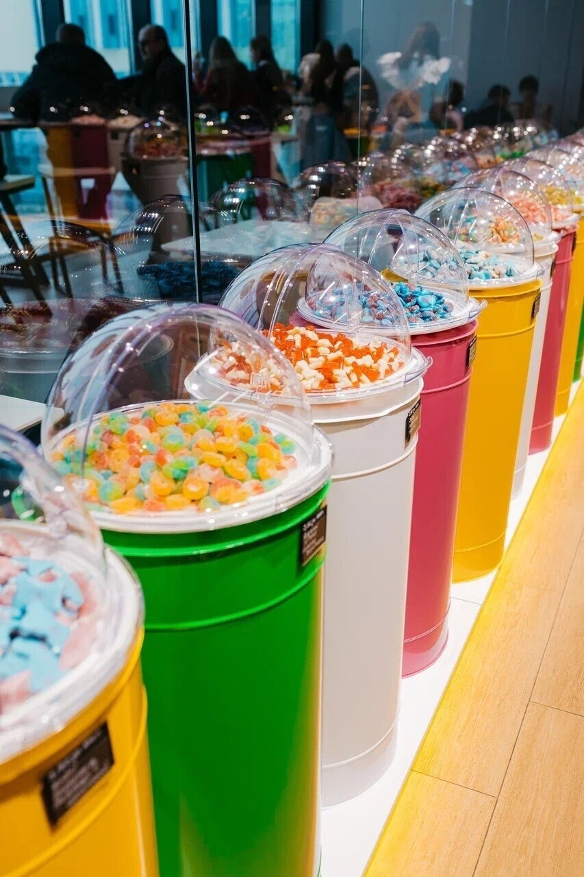 Магазин работает в концепции самообслуживания: при входе каждый фанат желатиновых конфет берет фирменный пакет, куда сам кладет приглянувшее лакомство. Продукция реализуется по одной цене, набираешь и взвешиваешь на кассе. Можно устроитьдегустацию, взяв по одной мармеладке каждого вида. А попробовать здесь есть что: жевательный мармелад сладкий и кислый, изделия из лакрицы и большой выбор маршмеллоу с начинкой и без.