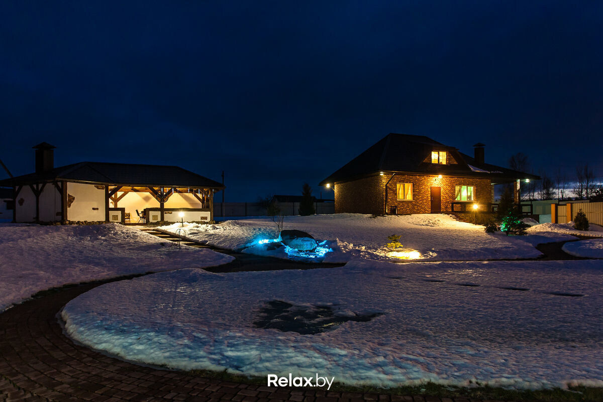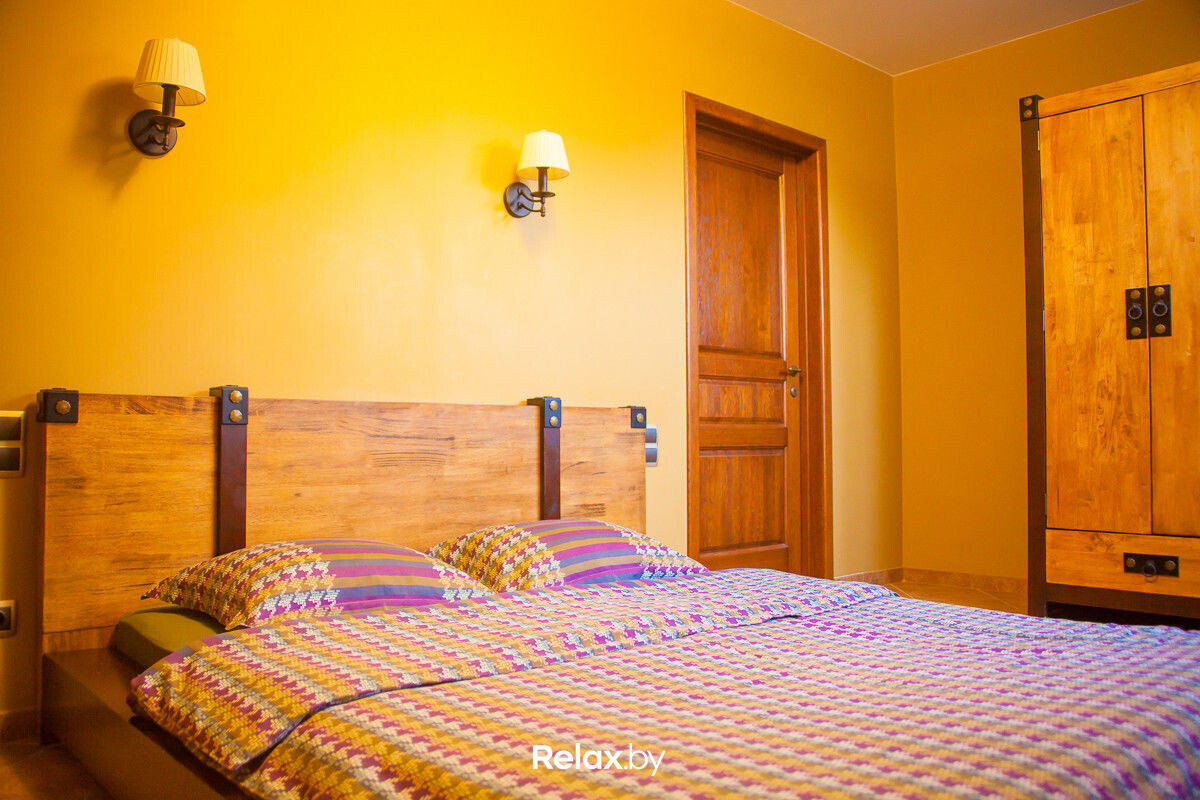 Коттедж расположен в живописном месте на территории биологического заказника республиканского значения — Антоново. Дизайн агроусадьбы очень гармоничный: в декоре удачно сочетаются натуральное дерево и камень. Помещения отделаны сосной, используются кованые элементы в интерьере, витые лестницы и массивные люстры.