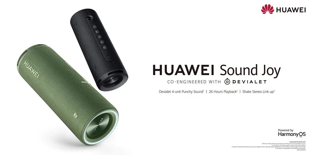 HUAWEI Sound Joy — это первая портативная колонка HUAWEI, разработанная совместно с компанией Devialet, которая гарантирует потрясающее качество звука благодаря системе из четырех динамиков. Колонка оснащена высокоёмкой батареей 8800 мА·ч и обеспечивает длительное время автономной работы: до 26 часов непрерывного воспроизведения. Устройство имеет защиту от воды и пыли по стандарту IP67, что позволяет пользователям наслаждаться потрясающим звучанием на открытом воздухе. Колонка доступна в двух цветах: черном (Obsidian Black) и зеленом (Spruce Green).