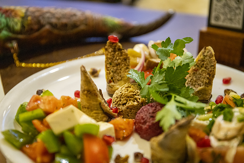 - холодный сет закусок: салат «Катмис» (100 г), салат с томатом и брынзой (100 г), салат с печеными баклажанами (100 г), ассорти из пхали (75 г), рулетики из баклажанов (75 г);