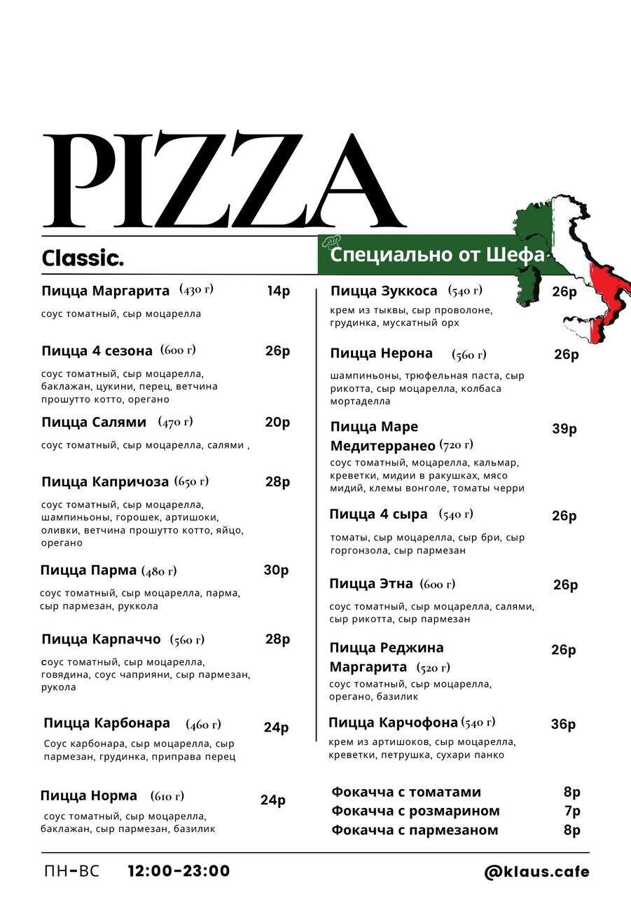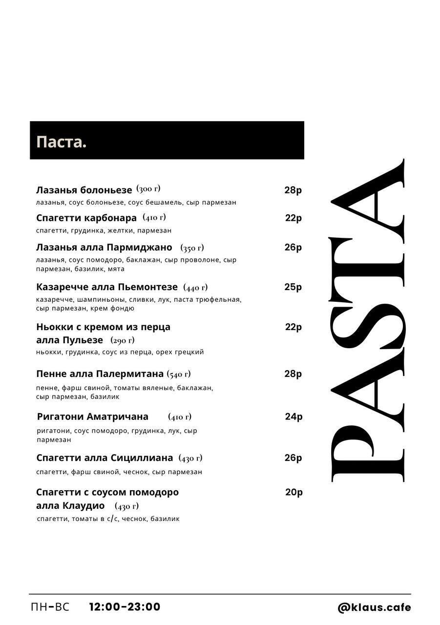 Всем известно, что итальянцы — большие гурманы и в еде признают только лучшее. В Klaus café особое внимание уделяют семейным традициям, вечной итальянской классике и необычным вкусовым сочетаниям. Поэтому новое меню от сразу двух шеф-поваров, Клаудио и Матиа Росса, получилось максимально разнообразным и уж очень аппетитным. Новые пасты, пиццы, ризотто, обилие морепродуктов и нежнейшие десерты. Все то, за что мы так любим Италию.