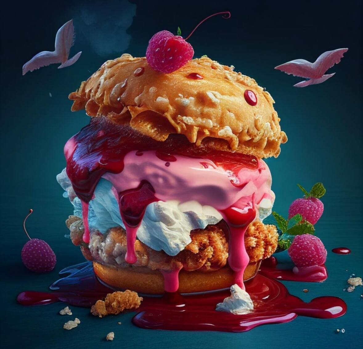 - Бургер с цыплёнком, мороженым, малиновым джемом и арахисовой пастой;