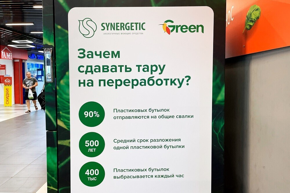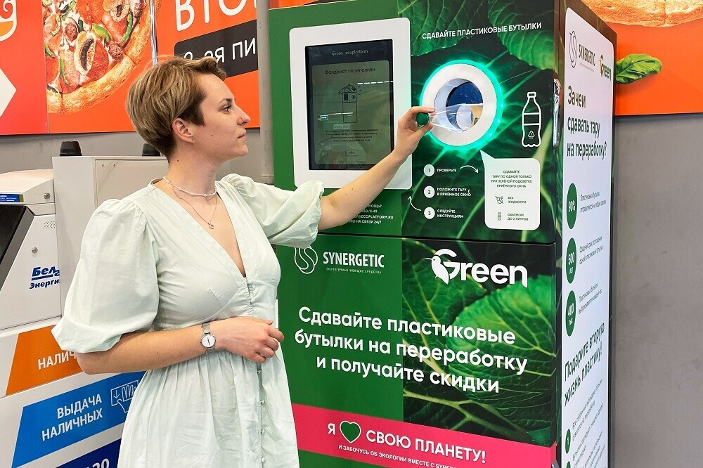 Просто возьмите ненужные бутылки с собой, когда идёте за покупками (или сохраните после пикника), и сдайте их в таромат, а заодно получите скидку на покупки в Green. Взамен на тару устройство выдаст вам ваучер со скидкой на чек в магазине — она считается исходя из количества бутылочек: