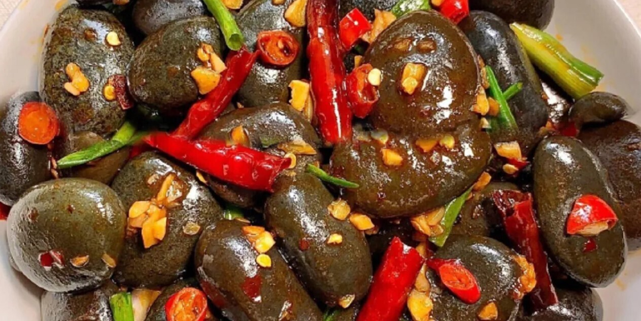 Повара смешивают камни со специями и овощами, чаще всего это чеснок и красный перец. Затем их поливают чесночным и соусом чили. Блюдо называют suodiu («сосать и выбрасывать»), сервируется оно в коробки размером с ладонь и продается за 16 юаней (5,6 руб). Довольные туристы облизывают каждый камешек и выплевывают их, радуюсь «деликатесу».