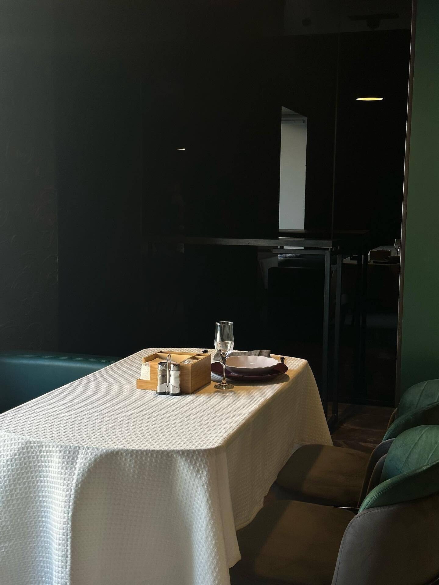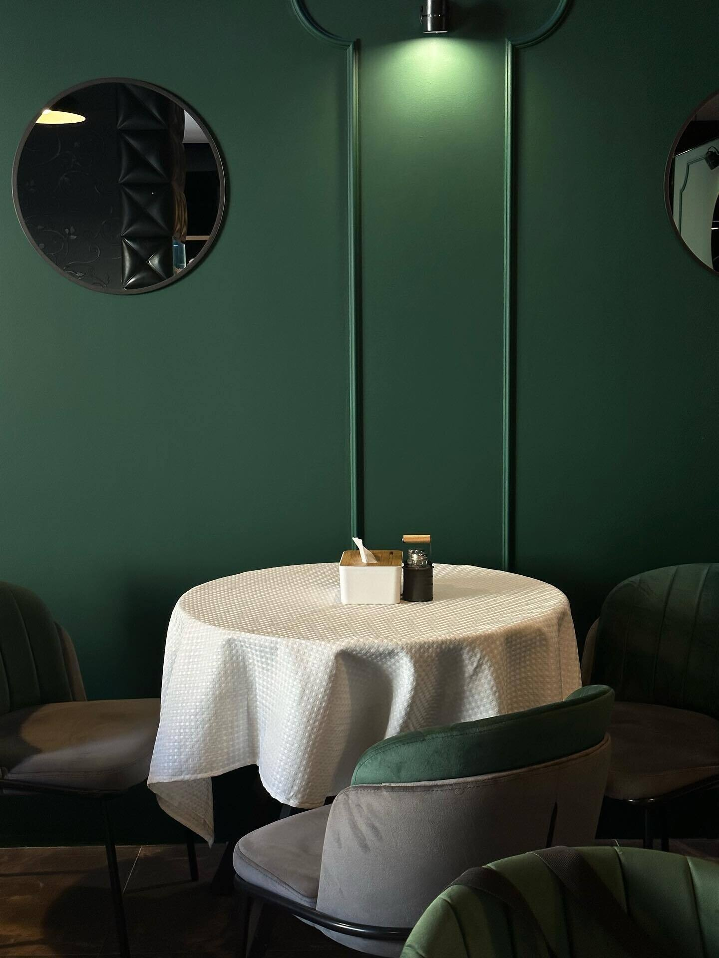 Информации о проекте пока крайне мало, но экстерьер с этими черно-белыми маркизами вы узнаете точно. Интерьер заведения выполнен в приглушенных тонах с акцентом на глубокий зеленый. Об открытии сообщает Телеграм-канал gdehodil.