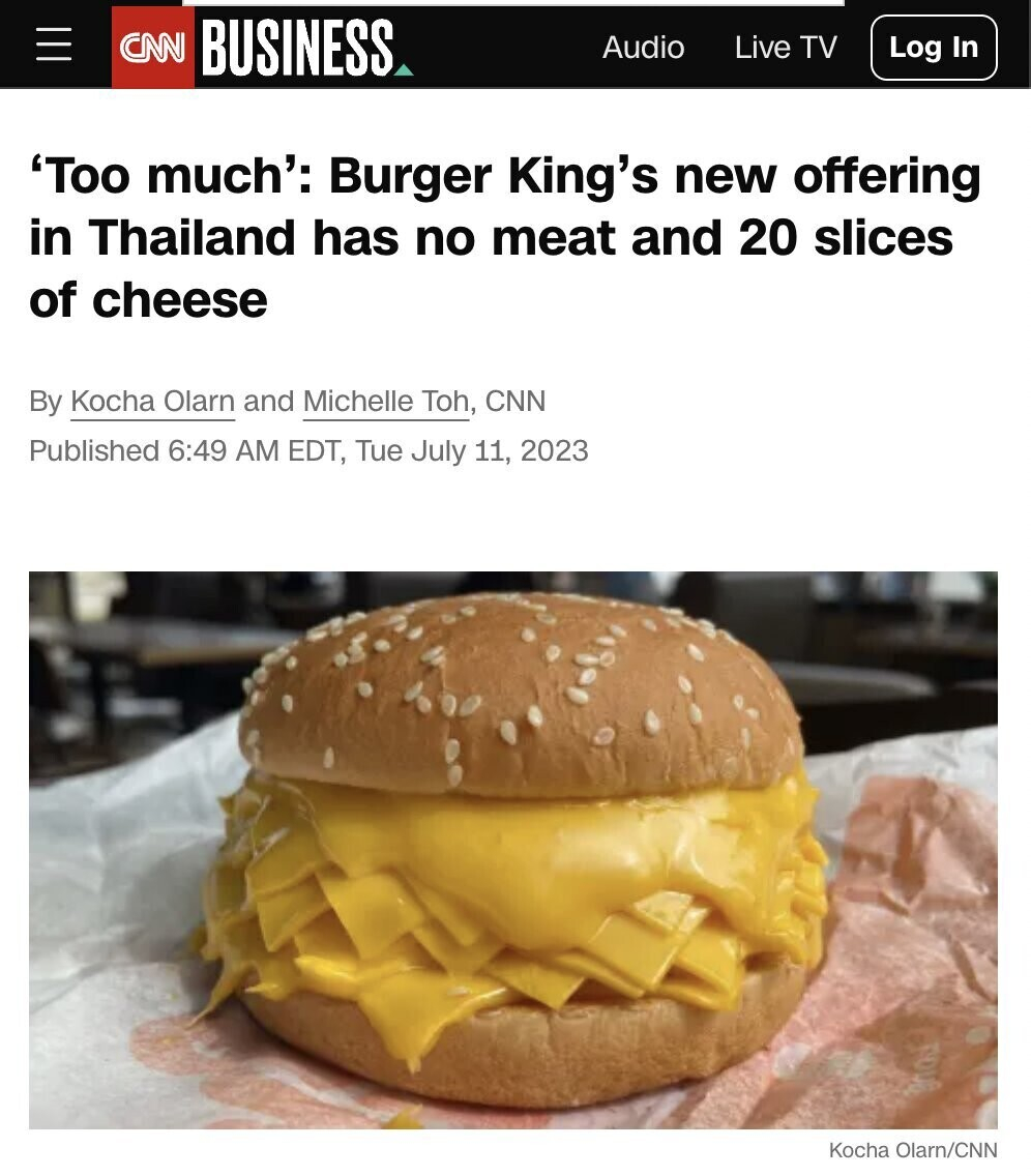 Burger King в Таиланде начал продавать «настоящие чизбургеры», пишет CNN. Интересно, что блюдо не содержит мяса, но в нем есть рекордное количество американского сыра — сразу 20 слайсов. Купить его можно за 109 тайских бат (около 3 долларов).