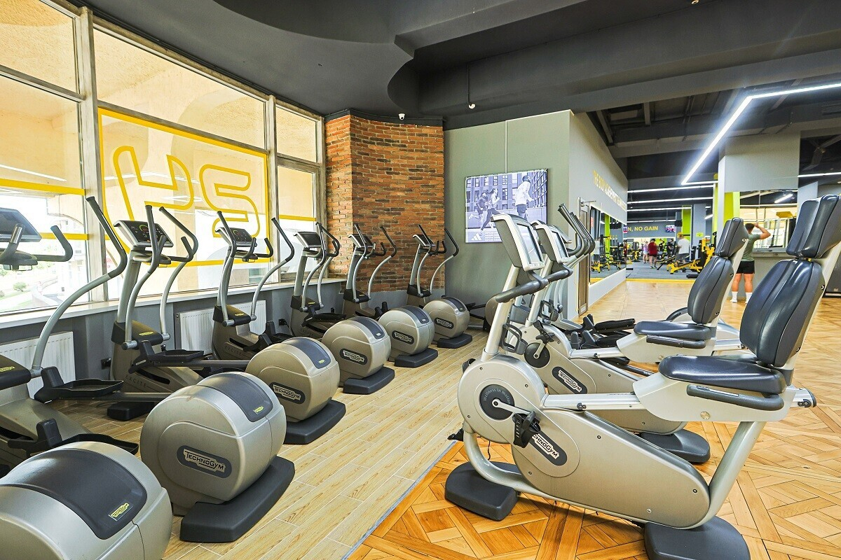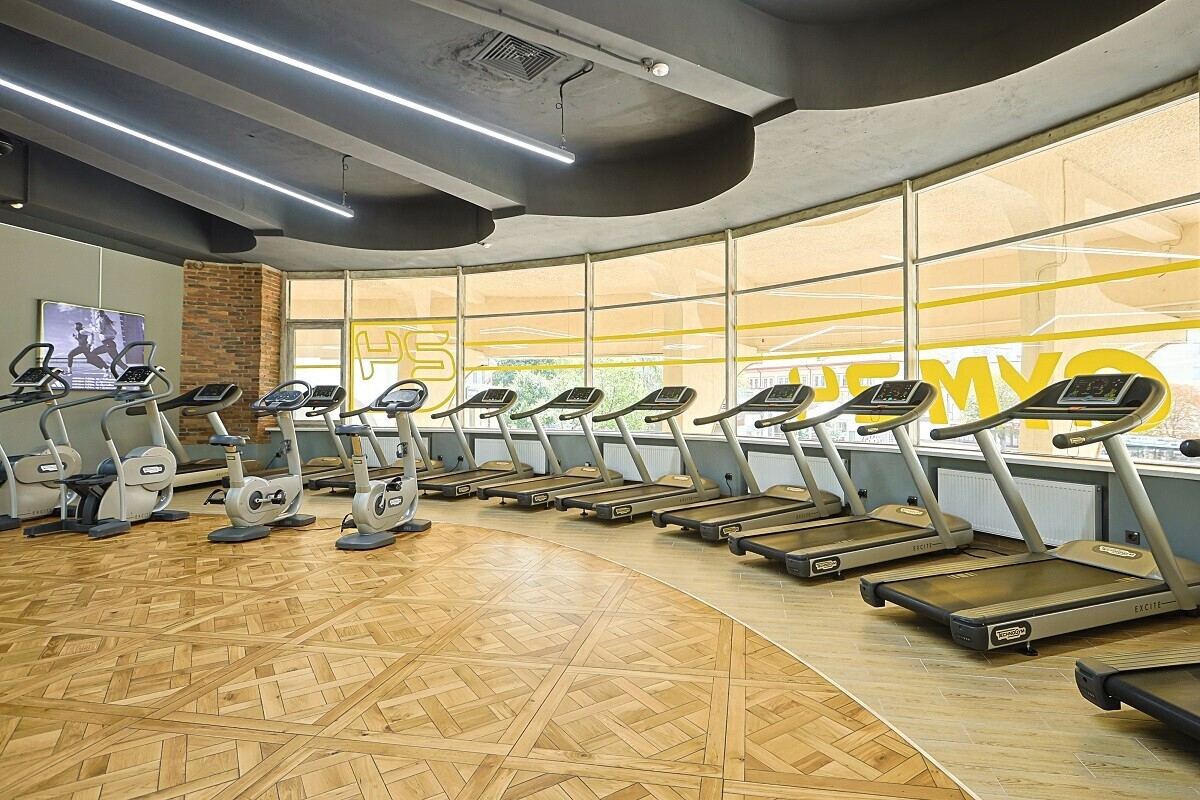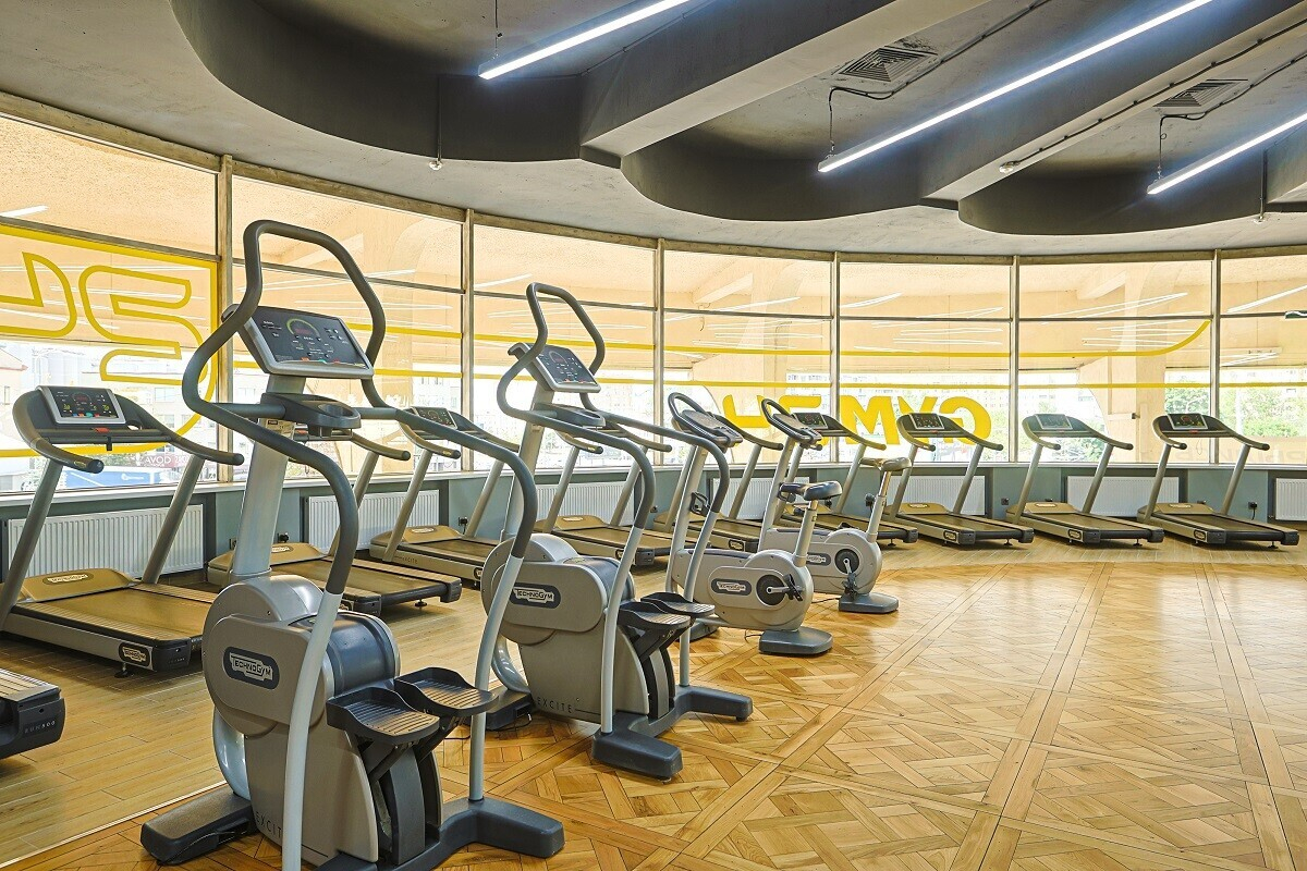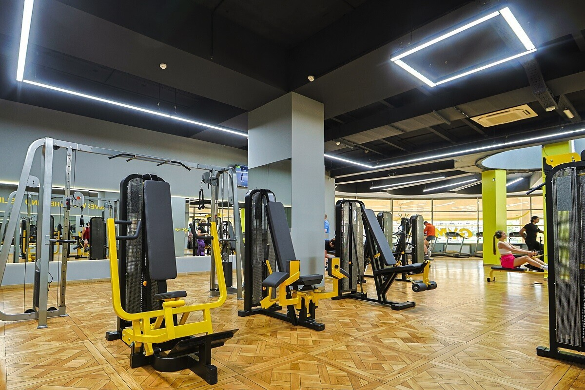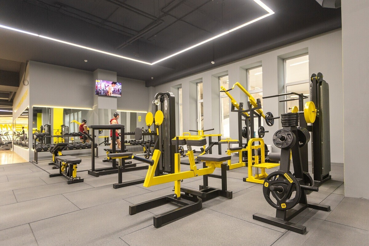 Для организации помещения тренажерного зала все стены были демонтированы, получилось открытое пространство. Площадь зала занимает 1200 кв. метров, здесь около 150 тренажеров. Самые популярные — в нескольких экземплярах: