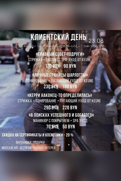 Атмосфера красоты, ярких нарядов, гламурных журналов и светских тусовок, женских посиделок. Напитки, чай, кофе, вкусные закуски и разговоры обо всем. Подарки в виде эксклюзивного парфюма из коллекции «Christian Louboutin» и супер выгодные предложения на комплексы.