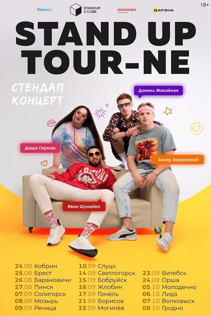 Белорусские комики едут в первый большой тур по Беларуси. 20 городов, 20 концертов, 2 месяца в гастрольном трипе. Четыре cамых работоспособных, крышесносно заряженных, безрассудно влюбленных в свое дело стендап-комика покидают на время минскую сцену, чтобы выступить в твоём городе.