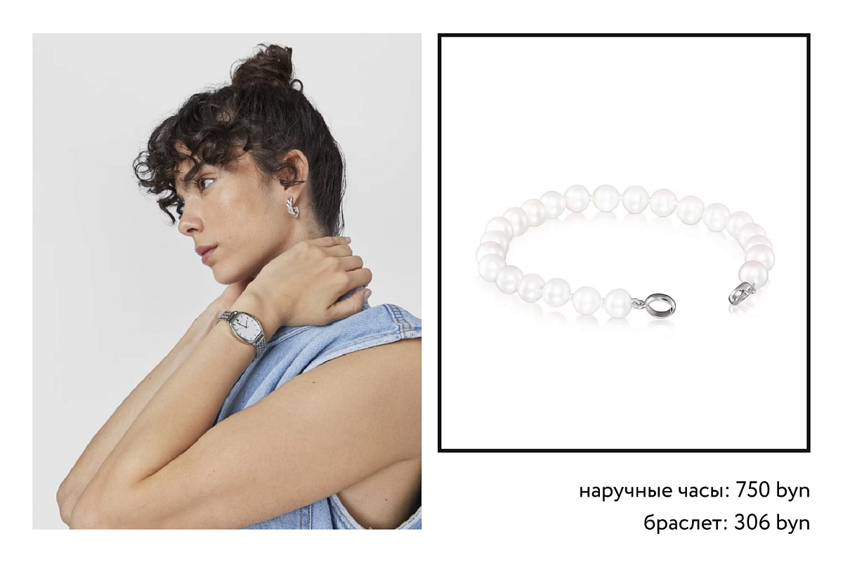 Для мамы предлагаем выбрать классику, которая долгие годы будет неизменно актуальна. Выбрали модель в серебре с циферблатом среднего размера, что мама точно оценит. Дизайн безусловно вне времени: мягкая округлая форма, стандартный металлический ремешок, который легко регулируется под запястье. В тренде носить часы на одной руке с браслетами, поэтому мы выбрали элегатную нить жемчуга с серебряной фурнитурой.