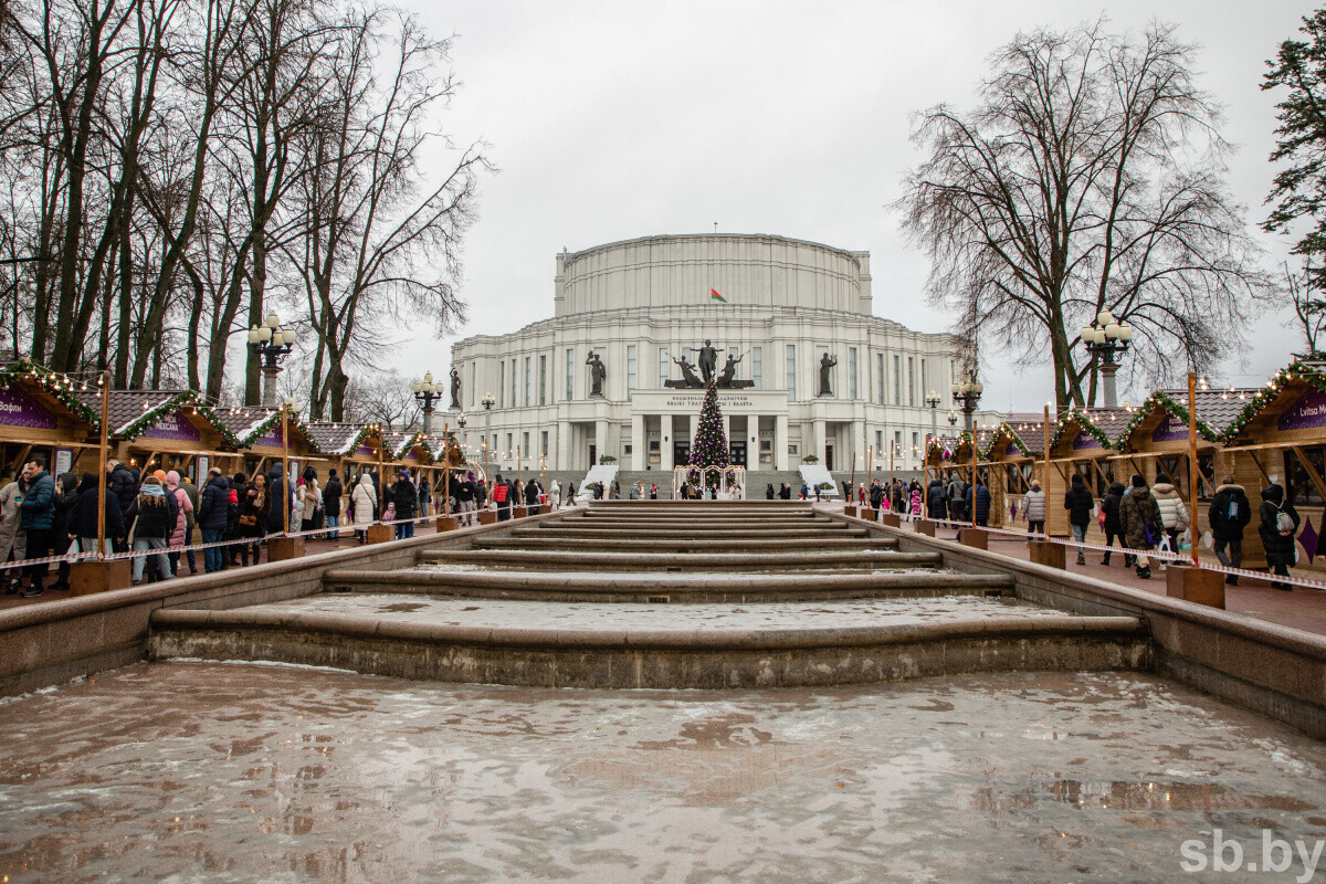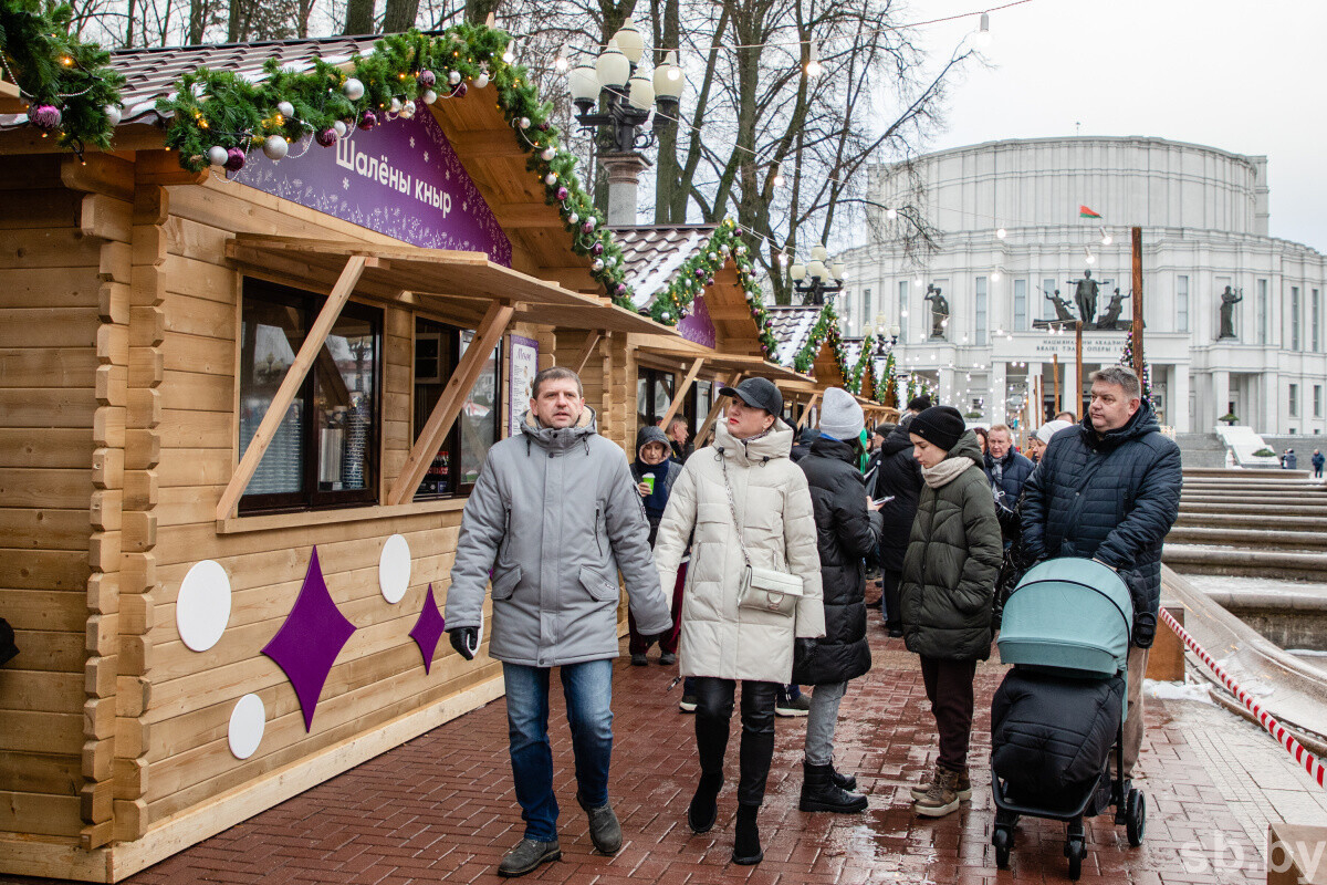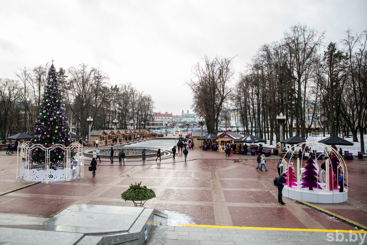 У Дворца спорта проходит «Калядны кірмаш», но в центре нашлось местечко для еще одной. «Зимняя ярмарка belbet» проходит на площади Парижской Коммуны возле Большого оперного театра. Основной городок развернулся вдоль каскада фонтанов.