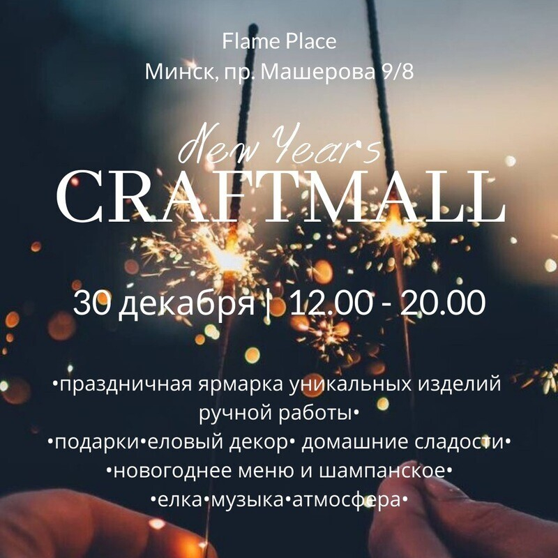 Вас ждет целый день предновогоднего волшебства и творчества. Праздничная ярмарка уникальных изделий ручной работы – особенные подарки, керамика и текстиль, украшения, еловые охапки и декор, елочные и детские игрушки, изысканная домашняя гастрономия. А также новогоднее меню и шампанское от ресторана Flame Place, елка, музыка, заряд праздничного настроения.