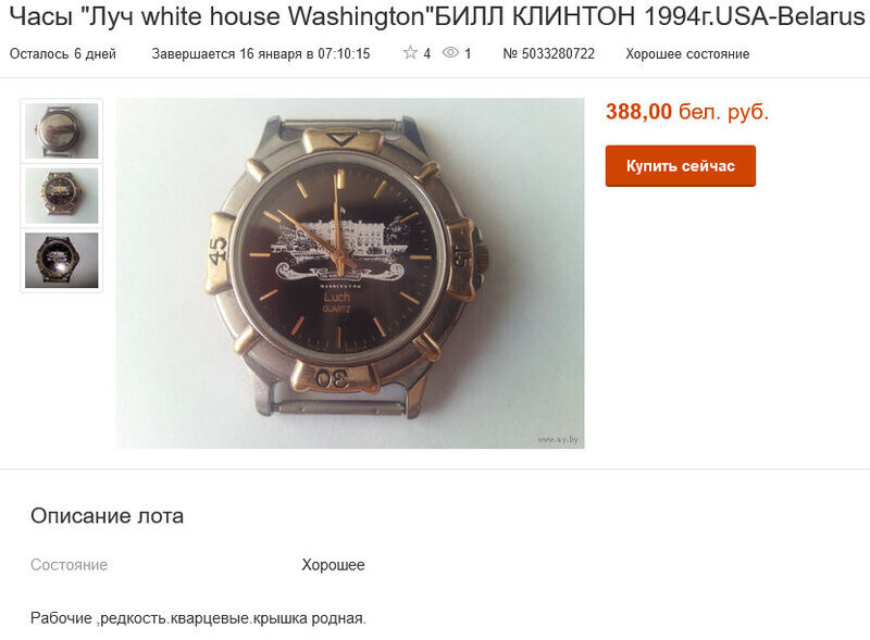 На одном из белорусских аукционов обнаружился интересный лот. Это наручные часы «Луч» с рисунком Белого дома и посвящением Биллу Клинтону, сообщает Близко бай.