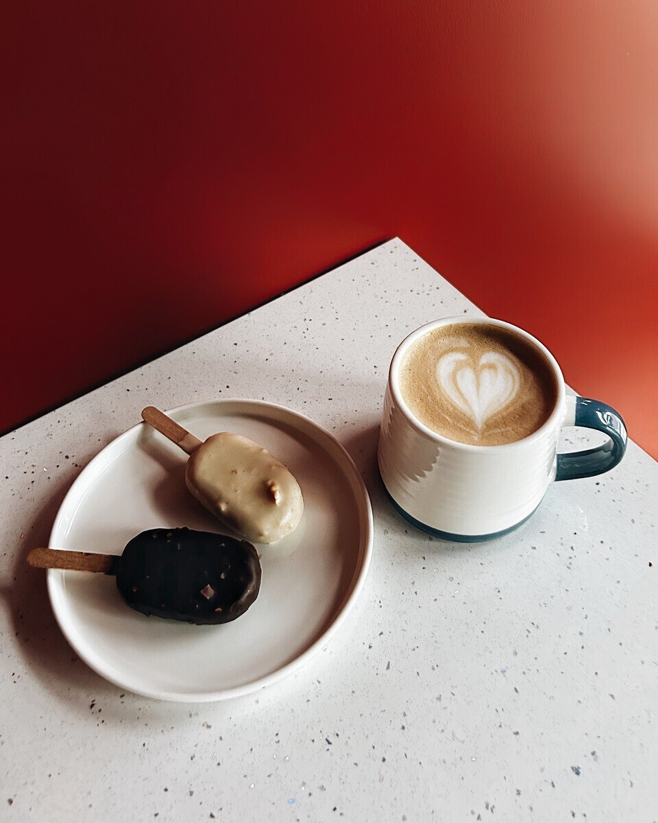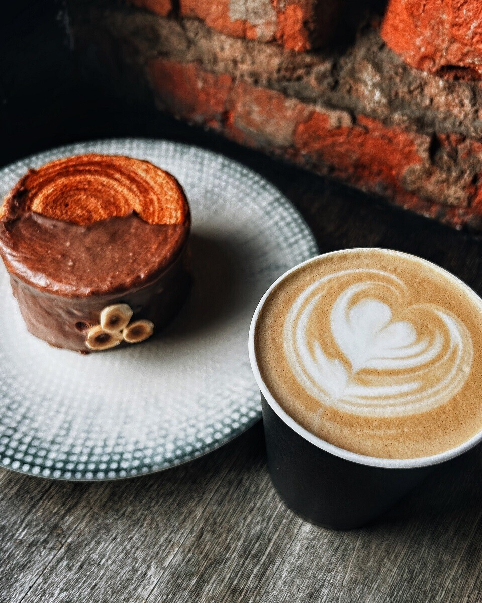 Флэт уайт на зерне из Гондураса + круассан-ролл с фундучным кремом.