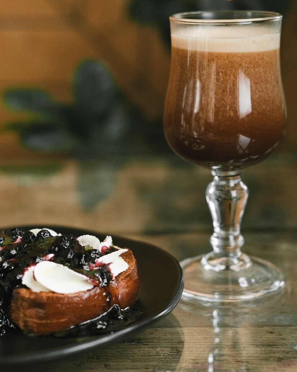 Кофейно-цветочный напиток на зерне из Эфиопии + хрустящий тост с сыром маскарпоне, черничным конфитюром и базиликовым маслом.