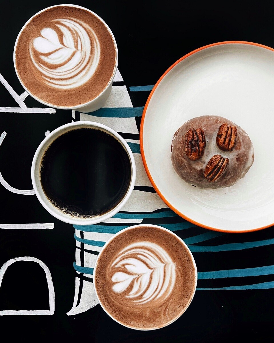 Моккачино / какао / фильтр (на выбор) на зерне из Кении + вегетарианский пончик с пеканом в кленовом сиропе.