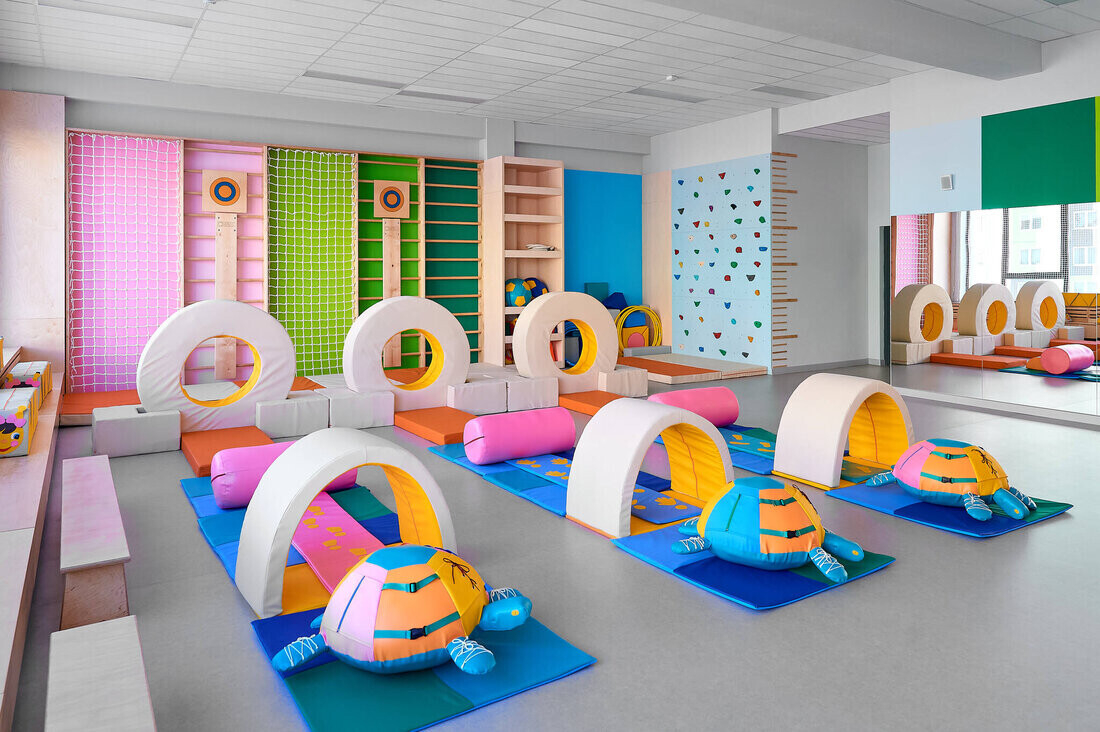 В здании обустроен спортзал с кольцами на стене, небольшим скалодромом и шведской стенкой. Рядом — музыкальный зал для утренников с мягкими местами для родителей. Также присутствуют кухня, прачечная, кабинеты психолога и дефектолога. Нашлось место и для медицинского блока с несколькими палатами-изоляторами на случай инфекций.