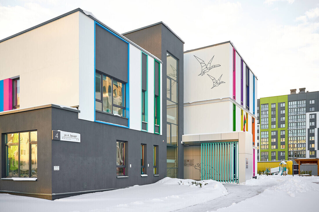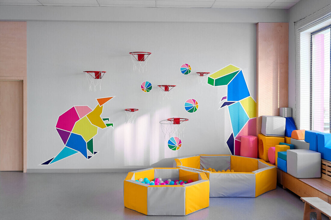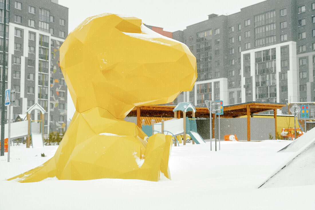 Тематика детсада прослеживается как внутри, так и снаружи корпуса. Динозавры встречают детей в коридорах, комнатах, на фасаде и игровых площадках. Местами они напоминают оригами из листов бумаги, чтобы ребята развивали воображение. А со двора на садик «поглядывает» его талисман и символ — желтый двухметровый динозавр Дино.