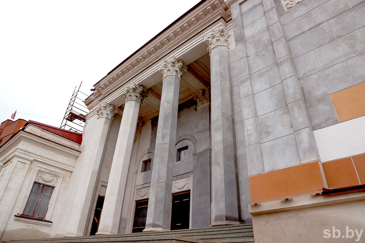 На сегодня «Белреставрация» уже восстановила сложные детали на фасаде здания, зал с колоннами и лепнину. В апреле-мае фасад покрасят в светло‑бежевый цвет — его выбирали по архивным данным.