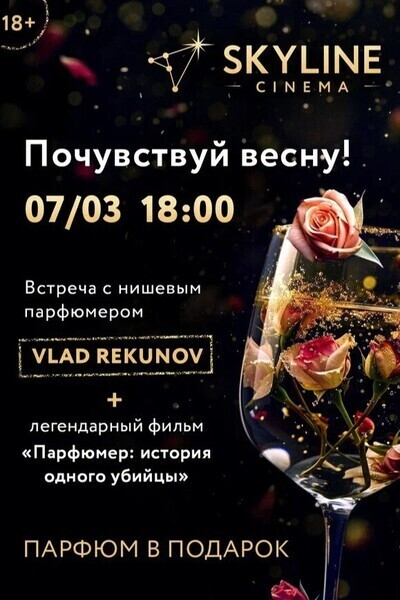 - В SKYLINE Cinema пройдет парфюмерный вечер: встреча с парфюмером, welcome drink, подарки, кино. Специальный гость, нишевый парфюмер, автор аромата для модного дома Pierre Cardin — Vlad Rekunov расскажет, как флакон духов может изменить нашу жизнь. А завершится вечер просмотром легендарного фильма «Парфюмер.История одного убийцы».